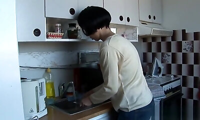Stepmom is surprised by her stepson and rams her hefty cock in the kitchen